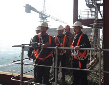 由于此次設(shè)備工程分公司承接的寧夏大地循環(huán)發(fā)展股份有限公司天瑞發(fā)電公司4×480t/h型高溫、高壓、循環(huán)流化床鍋爐安裝工程,為公司首次承接的最大型鍋爐安裝項目,因此倍受公司關(guān)注。14日,胡流芳一行到項目現(xiàn)場后,立即系上安全帶,登上54米高的鍋爐安裝平臺,一層一層的仔細查看安裝施工細節(jié),詳細了解質(zhì)量過程控制措施,認真檢查各部位的安全防護情況。與此同時,張娣玲對項目部工程施工質(zhì)量過程控制資料、安全資料等進行了認真檢查,并在項目部安全工作例會上對360多名參建員工就施工安全注意事項進行了重點強調(diào)。