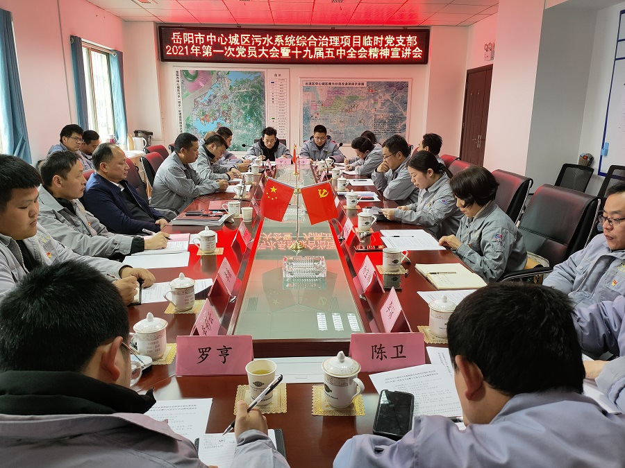 3月1日下午,岳陽市中心城區污水系統綜合治理項目臨時黨支部召開了2021年第一次黨員大會暨黨的十九屆五中全會精神宣講會。公司宣講團副團長、黨委副書記、總經理周鴻作宣講報告。項目臨時黨支部書記陳誠主持會議。支部26名黨員、入黨積極分子參加了學習。