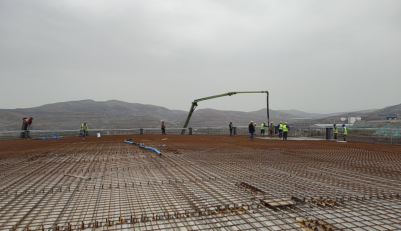 該后處理裝置高40米、寬42米,是聚甲醛項目最高單體工程。面對施工現(xiàn)場天泵受高大跨度和場地限制、混凝土澆筑危險因素多、施工難度大等不利因素,項目部積極與設計代表溝通,在樓頂進行優(yōu)化組織施工,既保證施工安全又提高了施工效率。經(jīng)過項目施工人員日夜接續(xù)奮戰(zhàn),圓滿完成了此次封頂施工任務。
