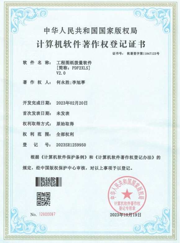 近日,公司取得由國(guó)家版權(quán)局頒發(fā)的《工程圖紙撥量軟件》著作權(quán)登記證書(shū)。這是公司繼《企業(yè)短信群發(fā)系統(tǒng)》《企業(yè)外經(jīng)證業(yè)務(wù)管理系統(tǒng)》后獲得的第3項(xiàng)計(jì)算機(jī)軟件著作權(quán)登記證書(shū)。