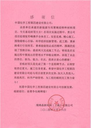 近日,璞烯晶新材料(上海)有限公司向華東公司發來感謝信,對項目團隊在璞烯晶新能源專用聚烯烴特種材料項目節點攻堅的突出表現予以高度贊揚和衷心感謝。