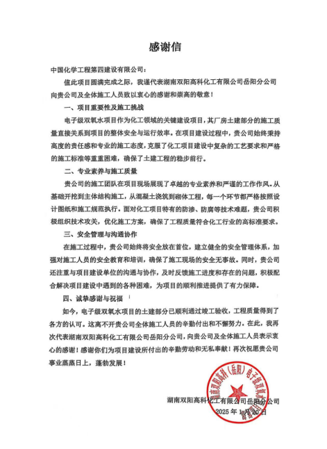 近日,建筑工程公司收到湖南雙陽高科化工有限公司岳陽分公司發來感謝信,對建筑工程公司在電子級雙氧水項目廠房土建施工中的突出表現給予高度認可和衷心感謝。