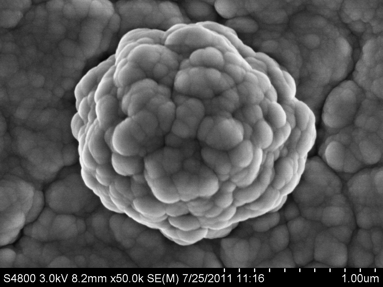 圖片描述:這張圖是金屬Ni在合金后縮聚形成的一個金屬小球,同時也是我們高頻高壓中心工藝線購入首臺掃描電子顯微鏡后最早拍攝的照片之一。從此我們的工藝線工藝監控、測量能力更上一層樓。為更好的開展器件研制和工藝開發起到了重要作用。