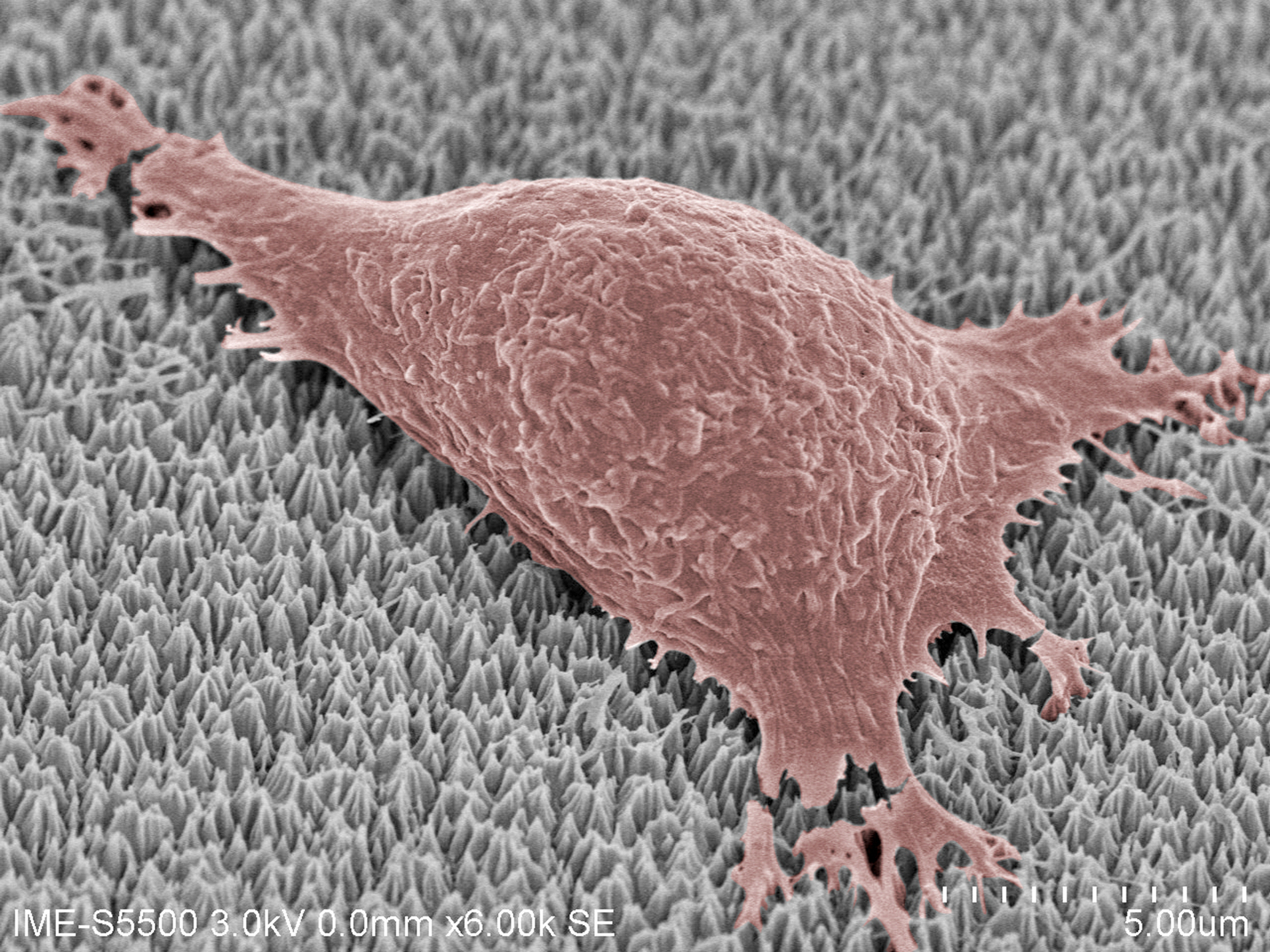 圖片描述:本作品顯示的是人乳腺癌細胞在硅納米錐陣列表面培養12小時后所拍的電鏡圖。納米荊棘將癌細胞牢牢固定在表面,任其隨意掙脫也無濟于事,最終成功戰勝了癌癥。不禁讓我想起疫情當下,14億中國人民共同努力抗擊新冠肺炎,阻斷病毒傳播的場景。在災難面前,我們從不言敗。武漢加油!中國加油!世界加油!