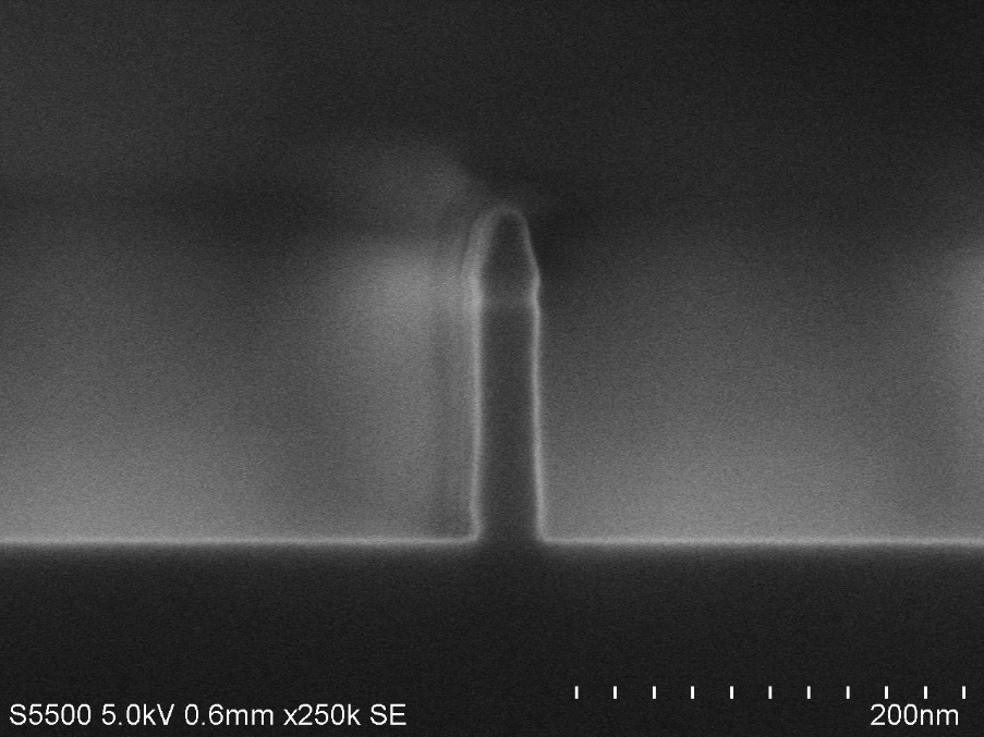 實驗方法:圖一是刻蝕后通過手工制樣(沒有FIB制樣設備,全部是手工切片),樣品大小為:長10mm,高5mm,切出新鮮的剖面,通過掃描電子顯微鏡觀測圖二所示的陡直度、掩膜厚度等剖面形貌,為下一步實驗優化提供重要依據。