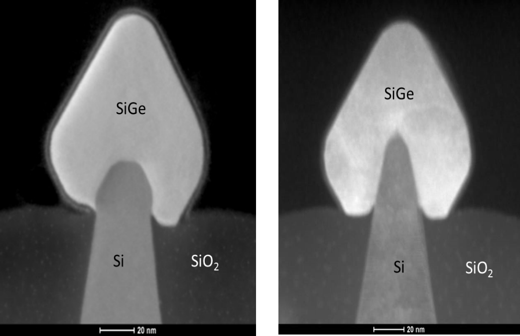 實驗方法:上圖的SiGe是通過減壓化學(xué)氣相沉積設(shè)備選擇性外延生長制備,在Fin上生長的SiGe呈三維形狀,SiO2上面沒有多晶的SiGe的生長。