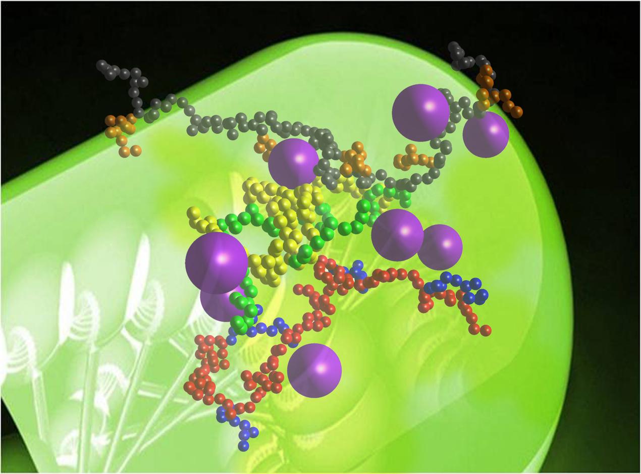 圖片描述:本作品展示的是梳形高分子聚合物納米復(fù)合材料中納米顆粒和聚合物間的空間結(jié)構(gòu)關(guān)系,大球表示納米顆粒,小球珠鏈表示梳形聚合物。納米顆粒猶如龍眼,聚合物主鏈猶如龍身,支鏈猶如龍爪。綠膜包裹球棍預(yù)示該復(fù)合材料在工業(yè)及生物等領(lǐng)域的應(yīng)用。