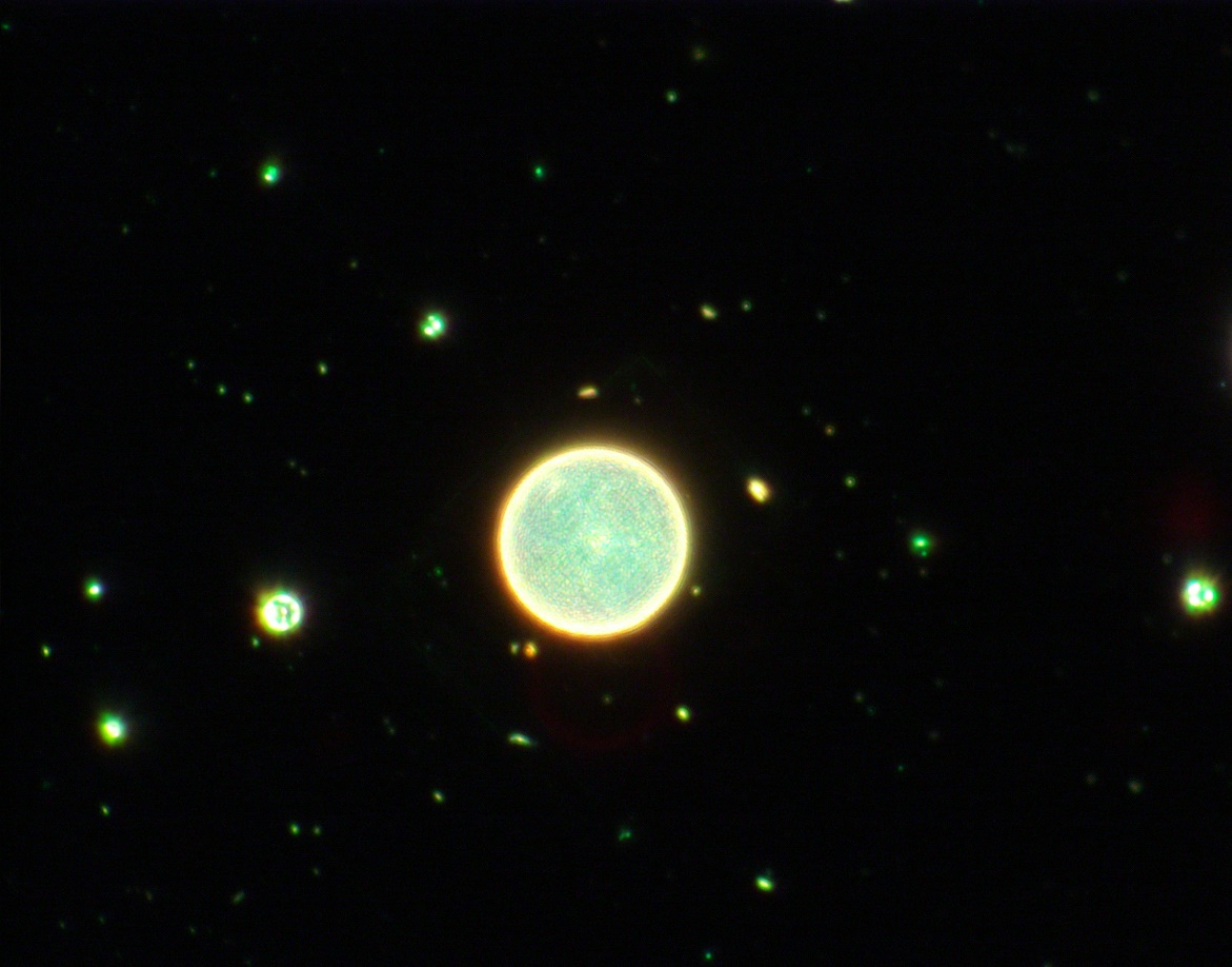 圖片描述:在超表面微元件的制備工藝摸索中,在顯微鏡視野下,陳列式的微結構及樣品上殘余的雜質所呈現出來的如星際般燦爛的景象。