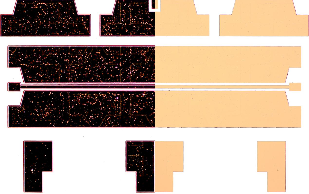 圖片描述:本作品顯示的是化合物半導(dǎo)體表面的金屬傳輸線和布線的光學(xué)顯微鏡照片,由明場像和暗場像組成。右側(cè)是明場像;左側(cè)是對應(yīng)區(qū)域暗場像的鏡像,清晰的顯示了明場像中無法看到的圖形。作品整體表現(xiàn)為“鼎”的圖案。右側(cè)金黃色代表“問鼎”的榮譽(yù)和光鮮;左側(cè)窗口內(nèi)酷似高空俯視城市夜景,猶如凌晨的北京城。作品寓意為,在看得見的科研成績背后,是看不見的無數(shù)個不眠的夜晚;只有經(jīng)歷過凌晨的北京,才能“問鼎”科技的高峰。