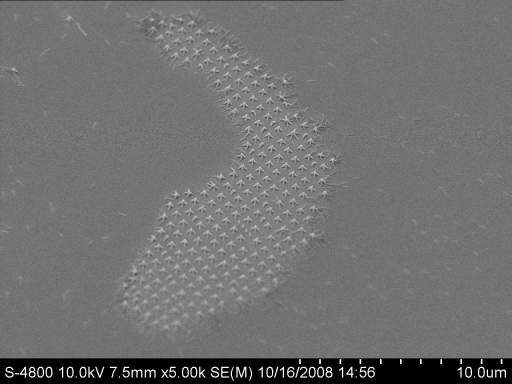 圖片描述:本作品顯示的是在電子束光刻實(shí)驗(yàn)中,電鏡下偶然發(fā)現(xiàn)的一尾精美的活生生的“納米魚(yú)”。放大后,可以發(fā)現(xiàn)其每一片魚(yú)鱗是由四個(gè)光刻膠納米柱搭成的“溝火堆”(見(jiàn)附圖a)。附圖中幾張精典的電鏡照片可以進(jìn)一步看到在電子束曝光顯影后清洗干燥過(guò)程中經(jīng)常遇到的一種現(xiàn)象:高高寬比納米結(jié)構(gòu)圖形粘連坍塌現(xiàn)象。這些照片為深入開(kāi)展電子束光刻工藝技術(shù)研究提供許多非常有用的信息。在圖d和e中顯示,在理想的電子束光刻工藝中可以獲得漂亮的20納米點(diǎn)陣,并能找到完美的5納米光刻膠格柵結(jié)構(gòu)。從事工藝技術(shù)研究,樂(lè)在其中!