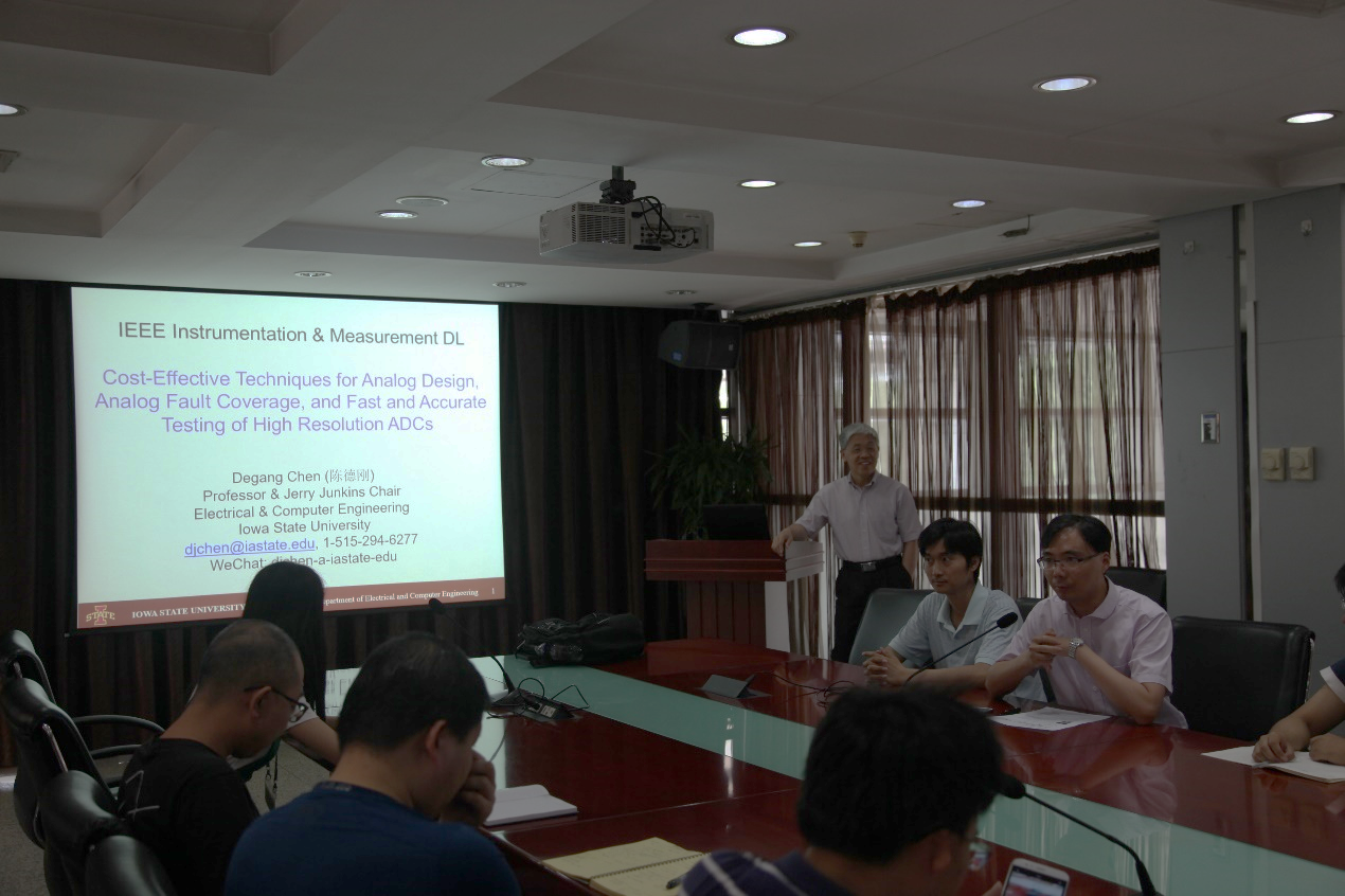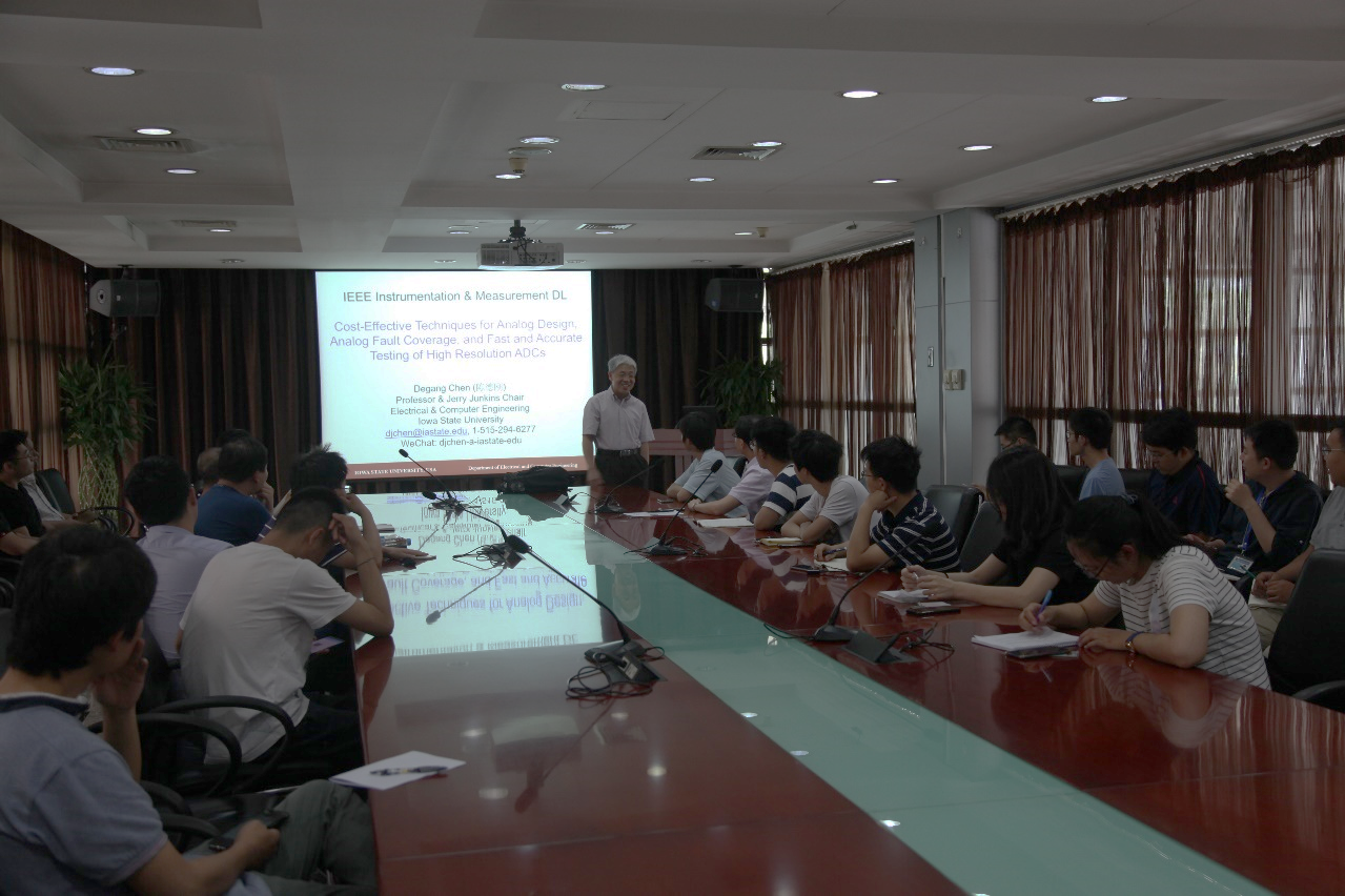 6月13日,微電子所團(tuán)委舉辦“崗位大練兵”系列報告會,邀請IEEE會士、美國愛荷華州立大學(xué)電氣和計算機(jī)工程講座教授陳德剛作了題為《用于模擬集成電路故障覆蓋以及高分辨率ADC快速準(zhǔn)確測試的片上高效自測試技術(shù)》的學(xué)術(shù)報告。微電子所職工、研究生近40人參加了報告會。報告會由所團(tuán)委副書記王鑫華主持。