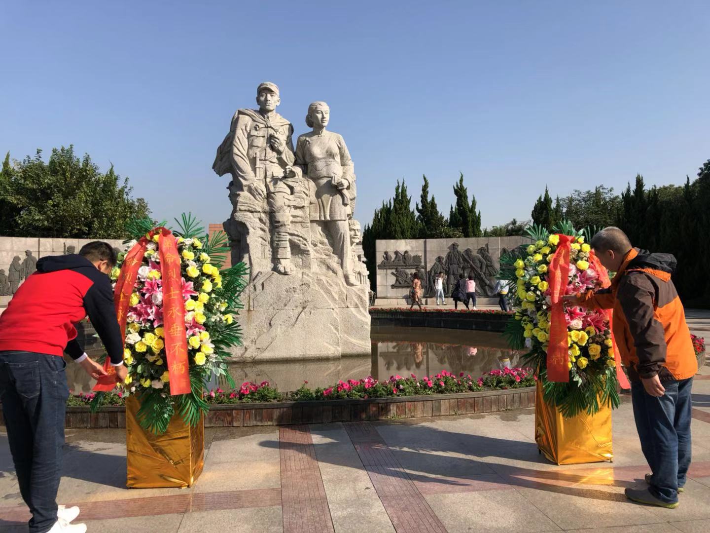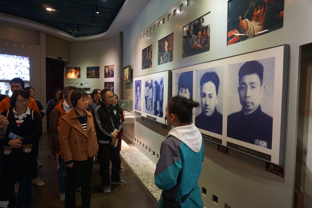 緩步走進莊嚴肅穆的瞻仰廣場,映入眼簾的是“郭建光”、“阿慶嫂”的形象創作的巨型主雕屹立在廣場中央。廣場兩側是象征新四軍18個傷病員的18根柱雕,以形態各異的塊面造型和強烈的肌理效果對比,淋漓盡致的表現出新四軍傷病員泰山壓頂不彎腰的革命精神。兩組鍛銅浮雕以細膩、生動的構圖和豐滿的人物形象,演繹深化了軍民雨水深情的主題。大家認真聆聽了江南抗日義勇軍歷史發展過程,細細體味著戰爭年代革命先烈艱苦卓絕的革命生活和血濃于水的軍民之情。作為革命教育基地,隨處可見的黨旗、國旗迎風招展,進一步激起了大家愛黨、愛國之情。大家面對鮮紅的黨旗,重溫了入黨誓言,細細品味這片革命先烈曾經灑下熱血的“紅土地”。
