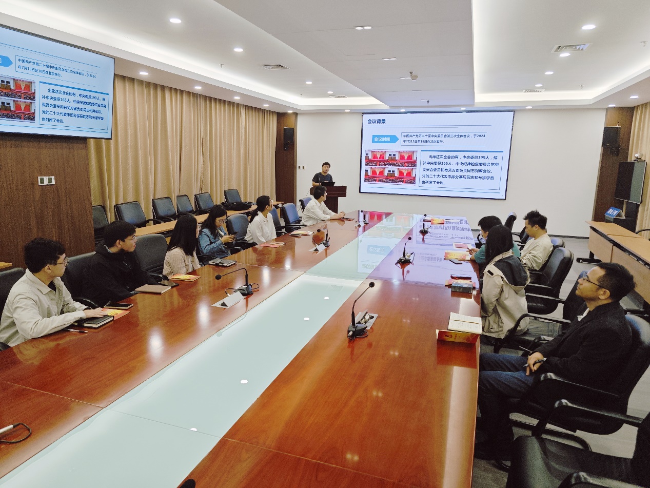 支部書記胡銳帶領全體黨員學習了黨的二十屆三中全會精神。黨的二十屆三中全會是在以中國式現代化全面推進強國建設、民族復興偉業的關鍵時期舉行的一次十分重要的會議。全會認為,面對紛繁復雜的國際國內形勢,面對新一輪科技革命和產業變革,面對人民群眾新期待,必須自覺把改革擺在更加突出位置,緊緊圍繞推進中國式現代化進一步全面深化改革。
