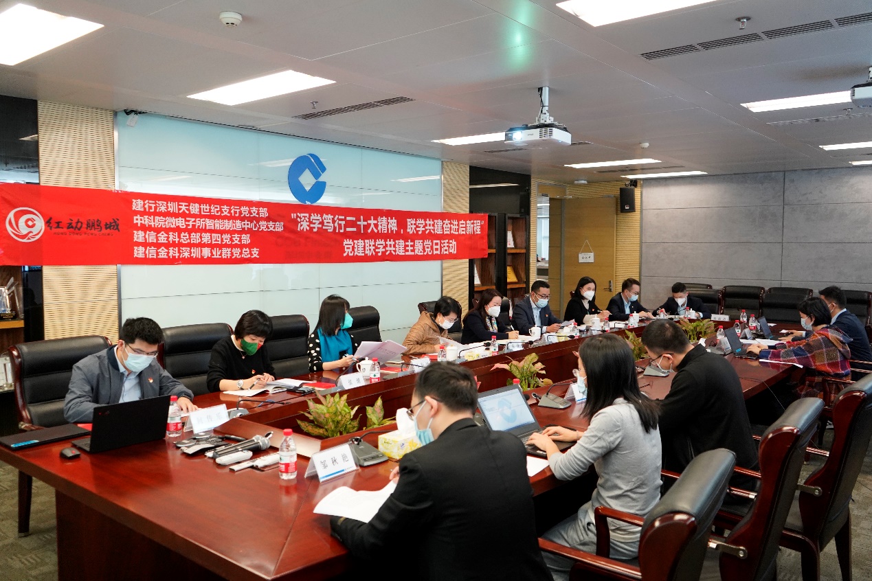 2023年1月9日,微電子所智能制造中心黨支部、建信金科總部第四黨支部、建信金科深圳事業(yè)群黨總支、建行深圳分行天健世紀支行黨支部聯(lián)合舉辦以“深學篤行二十大精神,聯(lián)學共建奮進啟新程”為主題的聯(lián)學共建主題黨日活動。建信金科總部第四黨支部書記、董事會秘書蔡軍同志,建信金科深圳事業(yè)群黨總支書記柏樺同志、中科院微電子所智能制造中心黨支部書記陳曙東同志、建行深圳分行天健世紀支行黨支部書記崔勁松同志參加了此次活動并進行了發(fā)言。