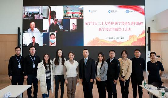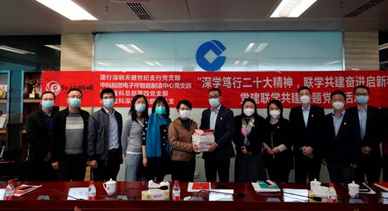 活動分為三個部分。第一部分是黨建工作及黨的二十大精神學習交流。建行深圳分行天健世紀支行黨支部書記崔勁松同志、中科院微電子所智能制造中心黨支部書記陳曙東同志、建信金科深圳事業(yè)群黨總支書記柏樺同志、建信金科總部第四黨支部書記、董事會秘書蔡軍同志分別介紹了所領導的支部開展的相關工作。第二部分開展了2023年聯(lián)學共建,黨建與業(yè)務相融合、業(yè)務與技術相融合項目研討。建行深圳分行天健世紀支行黨支部書記崔勁松同志提出了運用“圈鏈”思維,采用“產(chǎn)業(yè)+金融+數(shù)字化”的新金融打法,在服務科技企業(yè)和產(chǎn)業(yè)園區(qū)服務和網(wǎng)點主要客群、行業(yè)相關數(shù)據(jù)分析方面,希望能夠有更多的數(shù)字化手段等相關的業(yè)務需求,與會支部同志對此提出了相關的想法和觀點。第三部分是贈書的環(huán)節(jié),即中科院微電子所智能制造中心黨支部與建信金科總部第四黨支部互贈圖書、建信金科深圳事業(yè)群黨總支向建行深圳天健世紀支行黨支部互贈圖書。