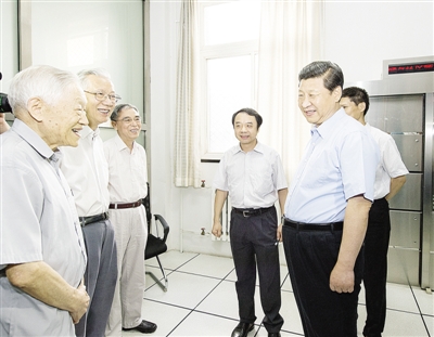 7月17日,習(xí)近平到中國科學(xué)院考察工作。這是習(xí)近平同當(dāng)年參與北京正負(fù)電子對撞機(jī)建設(shè)和應(yīng)用的3位院士交談。新華社記者 李學(xué)仁攝