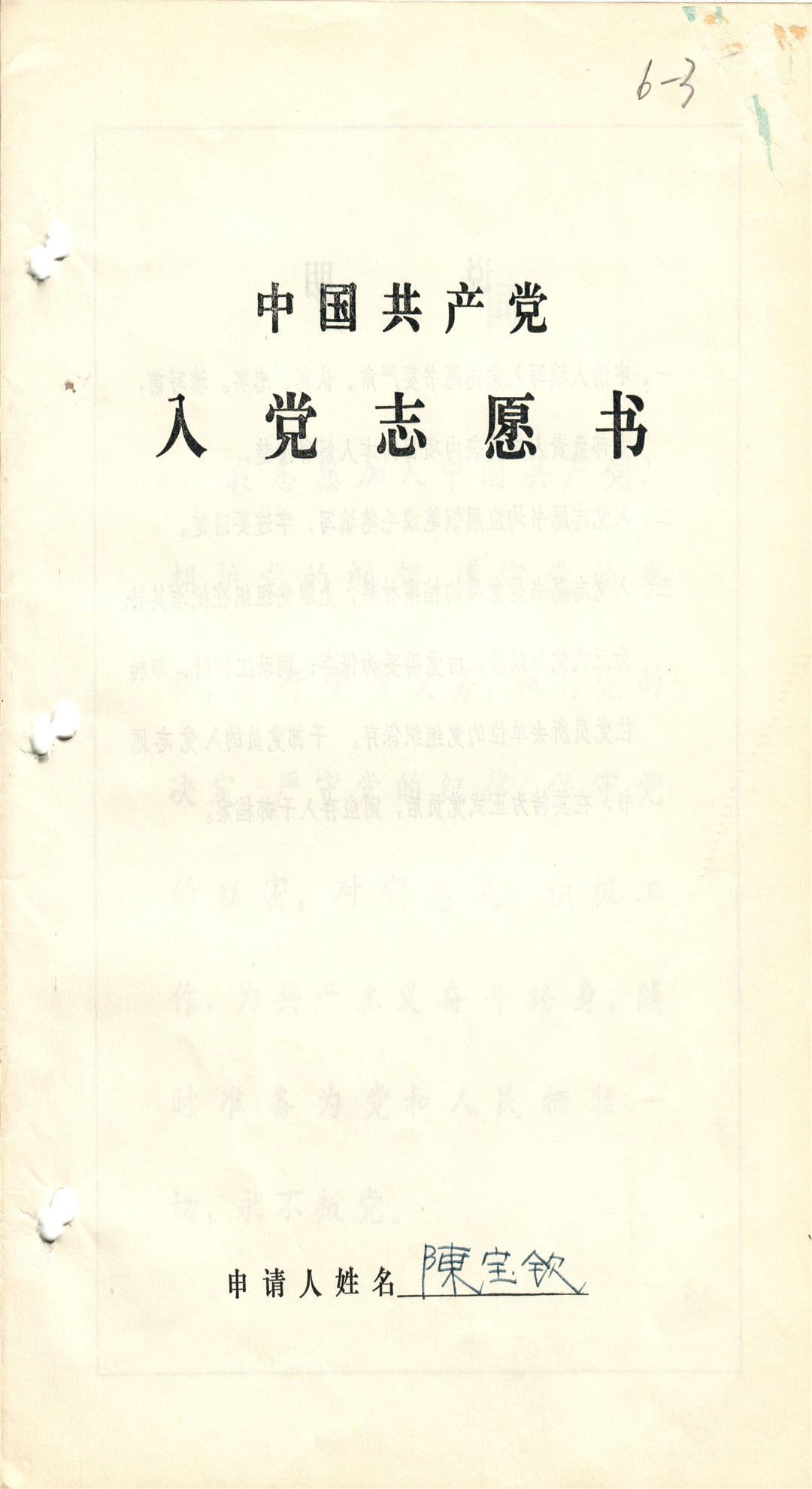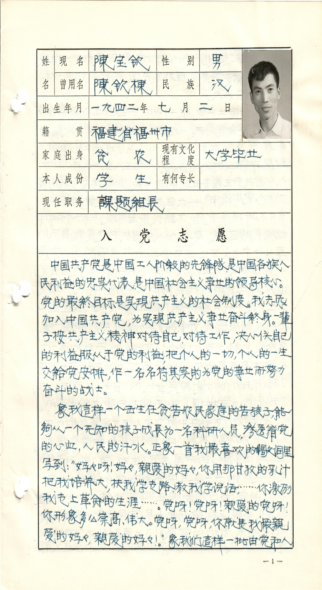 陳寶欽研究員入黨志愿書