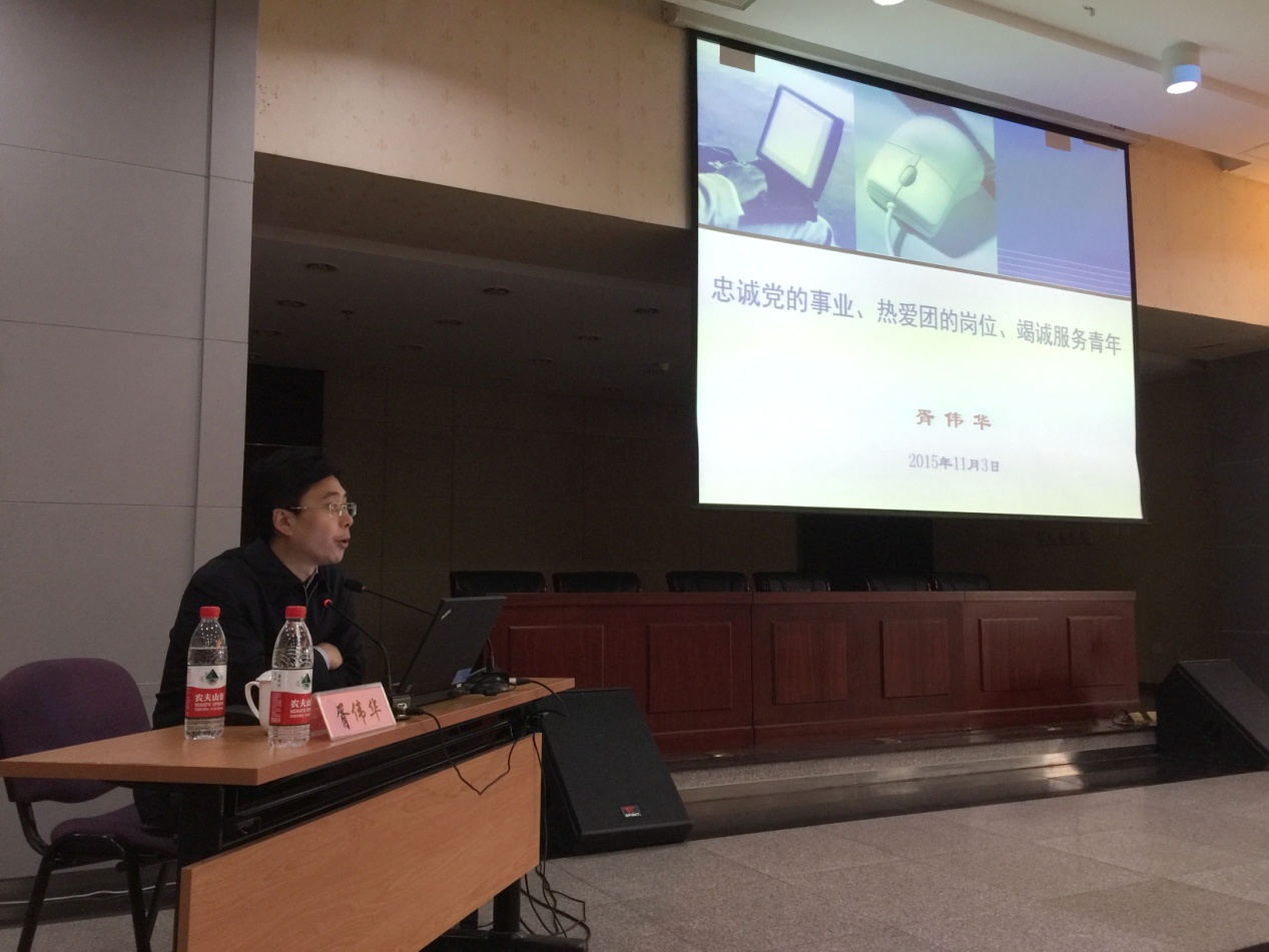 11月3日,北京分院第四協(xié)作片2015年度共青團(tuán)干部業(yè)務(wù)培訓(xùn)在微電子所舉行。全國(guó)青聯(lián)常委、中科院遺傳發(fā)育所黨委書(shū)記胥偉華應(yīng)邀作了題為《忠誠(chéng)黨的事業(yè) 熱愛(ài)團(tuán)的崗位 竭誠(chéng)服務(wù)青年》的報(bào)告。中科院團(tuán)委副書(shū)記馬強(qiáng)主持培訓(xùn)會(huì)。中科院團(tuán)委副書(shū)記李寒冰,中科院團(tuán)委委員、第四協(xié)作片各單位團(tuán)委書(shū)記、團(tuán)委委員、團(tuán)支部書(shū)記及學(xué)生干部共90余人參加了培訓(xùn)。