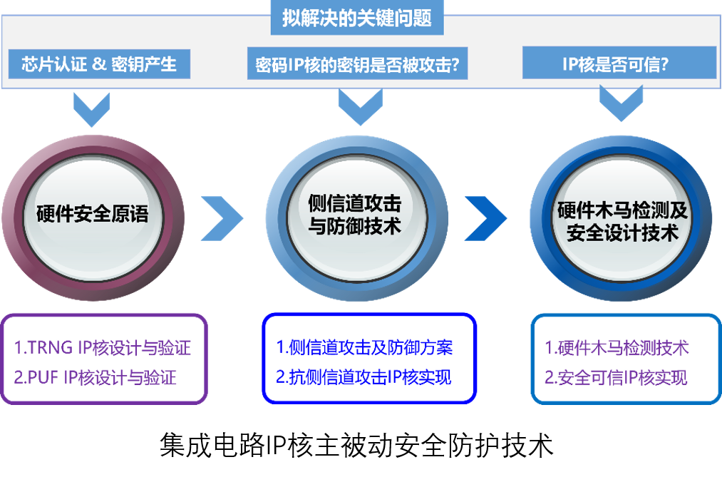 ★ 開展集成電路IP核主被動(dòng)安全防護(hù)技術(shù)研究,包括硬件安全原語電路設(shè)計(jì)技術(shù)、側(cè)信道攻擊與防御技術(shù)、硬件木馬檢測及安全設(shè)計(jì)技術(shù)。