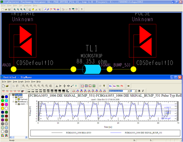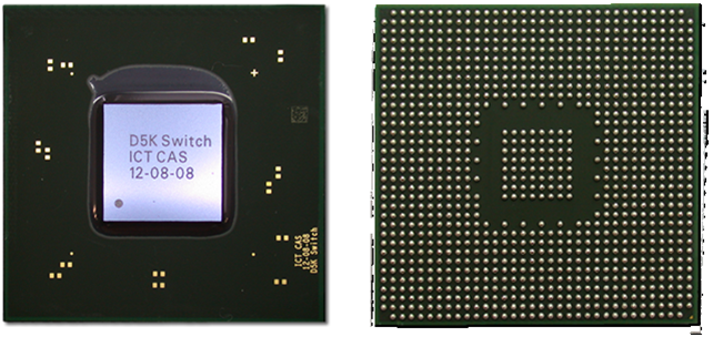 2009年由中科院EDA中心為中科院某研究所互連交換ASIC芯片D5K Switch開發(fā)的1053Pin FCBGA封裝已經(jīng)順利通過測試,該芯片用于863計劃重大專項支持的曙光5000A高效能計算機,下圖為D5K Switch芯片FCBGA封裝實物頂層和底層照片。D5K Switch芯片于09年4月在計算所通過DFT測試,在該所進行的功能測試表明該芯片工作正常。在該款FCBGA封裝項目中,針對芯片32組信號共1053個管腳,中科院EDA中心開發(fā)設(shè)計12層HDI BGA基板,分別委托Kyocera公司進行基板加工、ASAT公司進行Bumping and Assembly。該芯片封裝是國內(nèi)首款自主設(shè)計1000pin以上的FCBGA。