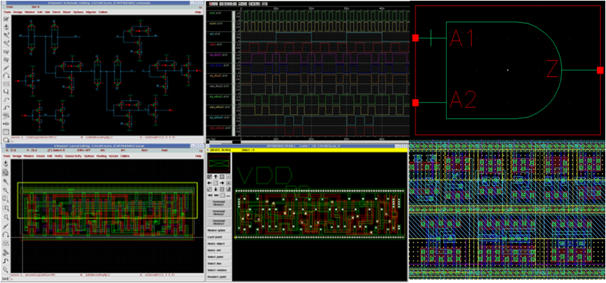 EDA中心在標(biāo)準(zhǔn)單元庫(kù)設(shè)計(jì)領(lǐng)域開展了十多年的研究工作。建立了完善的高密度/低功耗/高性能/高可靠/可制造性友好等專用標(biāo)準(zhǔn)單元庫(kù)技術(shù)方案,具有先進(jìn)的標(biāo)準(zhǔn)單元庫(kù)開發(fā)EDA工具和高效的批處理驗(yàn)證腳本平臺(tái)。目前為止,已經(jīng)基于國(guó)內(nèi)主流的40nm/65nm/90nm/0.5um/ 600V BCD和CNT-FET工藝開發(fā)了6套專用的標(biāo)準(zhǔn)單元庫(kù)。所開發(fā)的標(biāo)準(zhǔn)