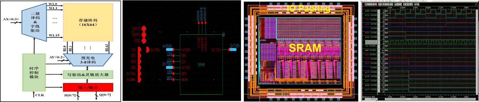 EDA中心具有專業(yè)的IC設(shè)計(jì)平臺(tái),團(tuán)隊(duì)積累了多年硅基與碳基SRAM設(shè)計(jì)經(jīng)驗(yàn),形成了有效的高性能/高密度/低功耗SRAM設(shè)計(jì)方案,并支持SRAM的全速測(cè)試芯片設(shè)計(jì)服務(wù),同時(shí)具備完善的測(cè)試計(jì)劃。目前,已經(jīng)基于國(guó)內(nèi)主流Fab 硅基28nm工藝,實(shí)現(xiàn)了512Kbit、8Kbit的SRAM IP核;在碳基方面,設(shè)計(jì)實(shí)現(xiàn)了多款1Kbit、512bit和64bit SRAM芯片并已流片。