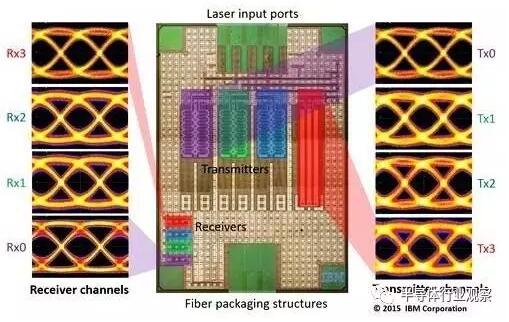 以IBM為例,在2015年,該公司對外展示了一款號稱完全整合的分波多任務CMOS硅光子(silicon photonics)芯片。時任IBM Research硅光子部門(Silicon Photonics Group)經(jīng)理Will Green表示,該芯片的4個laser信道──分別以25Gbps的速度在芯片上運作──是以鍺(germanium)光學探測器以及光學解多任務器(demultiplexers),將之融合為單一100Gbps電子信號,在需要時進行處理;該電子信號能以干涉儀(interferometers)調(diào)變四道芯片外的laser,成為在芯片邊緣外行進的光脈沖。