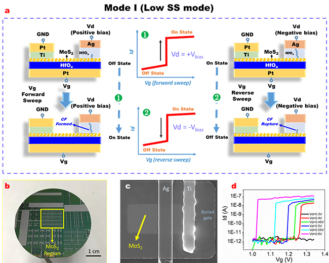 在模式一中,通過施加不同極性的漏極偏置和不同方向的柵極掃描電壓,調(diào)控漏極和溝道間阻變層電場大小和方向,使得阻變層中的導(dǎo)電細(xì)絲導(dǎo)通和斷裂。在其導(dǎo)通和斷裂的瞬間,溝道電流發(fā)生突變從而實(shí)現(xiàn)超低的亞閾值斜率(圖1a)。利用化學(xué)氣相淀積生長的大面積二硫化鉬薄膜使得該器件可達(dá)到晶圓級制備規(guī)模 (圖1b)。其器件結(jié)構(gòu)如圖1c所示,在該器件中獲得了2.26 mV/dec的超低亞閾值斜率(圖1d)。