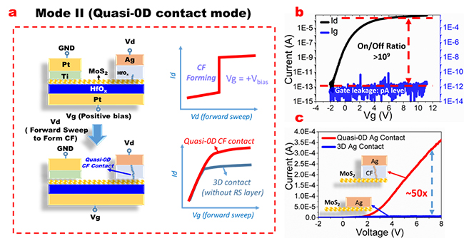 圖 2. (a)二硫化鉬導(dǎo)電細(xì)絲晶體管模式II運(yùn)行示意圖;(b)模式二下該晶體管的柵控電流傳輸曲線和柵極漏電流;(c)準(zhǔn)零維結(jié)構(gòu)晶體管(模式二)和對照組傳統(tǒng)三維接觸的開態(tài)電流對比。