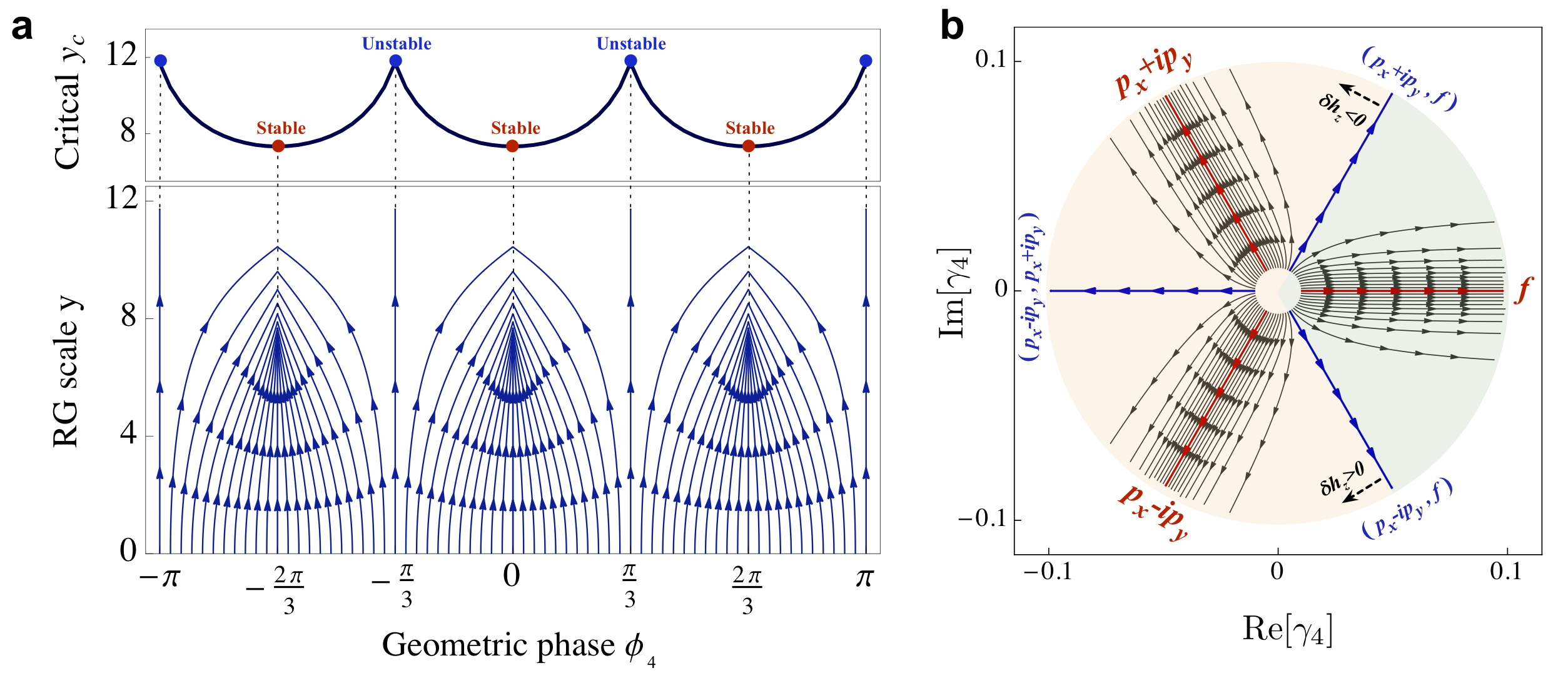 圖:(a)泛函重整化后的幾何相位流向三個穩(wěn)定不動點;(b)超導(dǎo)配對對稱性相圖。