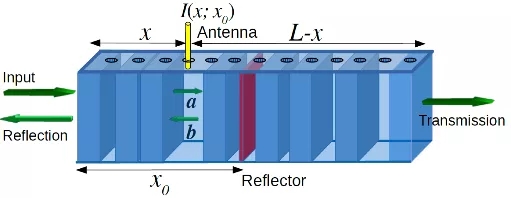 田矗舜與合作者發(fā)展了其建立的開放無序介質(zhì)中波傳播的超對稱理論,并結(jié)合黎曼對稱超空間G/K的熱核方法對波統(tǒng)計(jì)進(jìn)行研究。例如,當(dāng)非均勻性由嵌入介質(zhì)內(nèi)部深度x0的反射鏡(附圖)引起時(shí),可把深度x處的任意物理量或其統(tǒng)計(jì)分布O(x;x0)用熱核及相關(guān)量一般地表為: