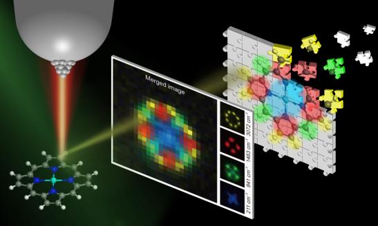 掃描拉曼埃分辨顯微術(shù)(SRP)的藝術(shù)化效果圖。高度局域化的等離激元電磁場會顯著增強針尖下方單個分子內(nèi)部局域化學(xué)基團的拉曼散射信號。將不同化學(xué)基團簡正振動模式對應(yīng)的拉曼成像圖樣進行合并,就可以采用類似“堆積木”的方式將各個化學(xué)基團拼接起來,構(gòu)建出完整的分子化學(xué)結(jié)構(gòu)。