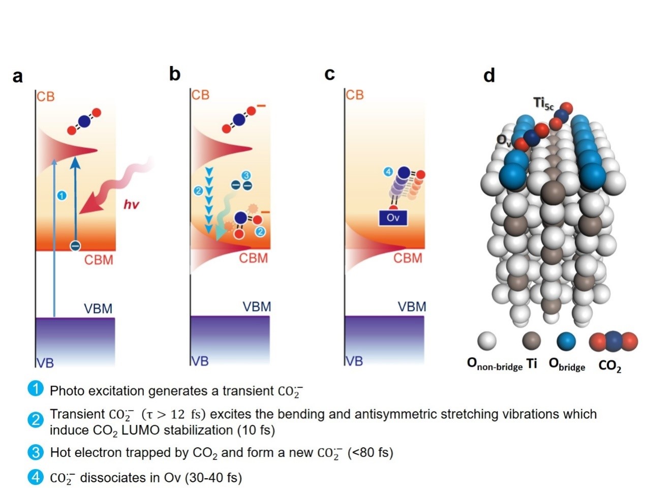 圖片說(shuō)明: TiO2表面CO2光致解離過(guò)程。(1) 光激發(fā)產(chǎn)生具有一定壽命的瞬態(tài)CO2.-; (2) CO2.-壽命大于12fs時(shí),彎曲振動(dòng)模式與非對(duì)稱拉伸振動(dòng)模式被激發(fā),CO2 LUMO在10 fs之內(nèi)被降低至導(dǎo)帶底之下;(3) CO2在80 fs的時(shí)間內(nèi)捕獲熱電子并重新形成穩(wěn)定的CO2.-;(4) 30-40 fs之后CO2.-解離。