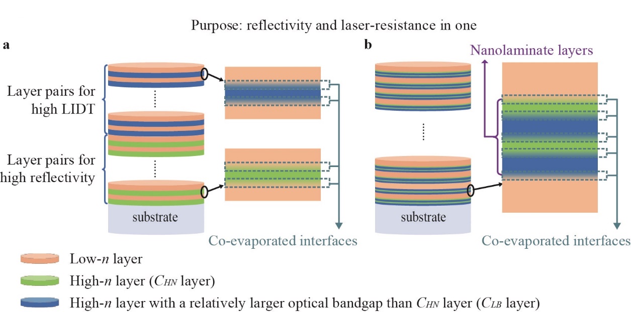 圖1 高激光損傷閾值反射薄膜膜系設計的結構示意圖。(a)傳統組合膜系設計和(b)新型納米疊層膜系設計示意圖。