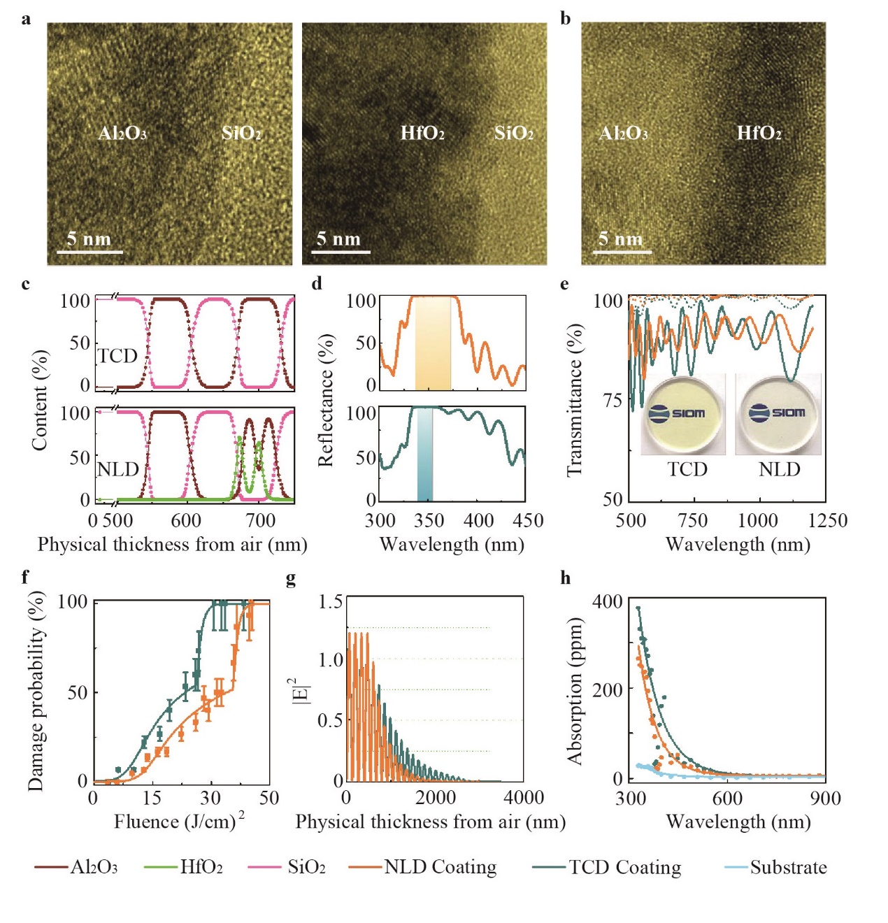 圖2 傳統組合膜系設計和基于納米疊層膜系設計的紫外反射薄膜性能。(a)TCD和(b)NLD薄膜的剖面形貌;(c)SiO2,Al2O3和HfO2含量隨膜層深度的變化曲線;(d)反射和(e)透射光譜曲線(45°入射角,實線:s偏振光,點線:p偏振光);(f)單脈沖損傷概率與激光輻照能量的關系;(g)電場強度分布曲線;(h)吸收隨波長的變化曲線。