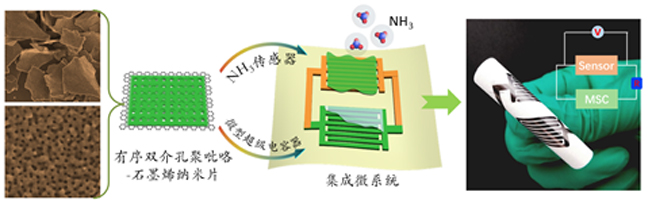 近日,中國科學院大連化學物理研究所二維材料與能源器件研究組研究員吳忠帥團隊與化學傳感器研究組研究員馮亮團隊合作,設計并可控制備出一種有序雙介孔聚吡咯/石墨烯納米片,以其作為雙功能活性材料構筑出高性能、柔性化的微型超級電容器-氣體傳感器平面化集成微系統。