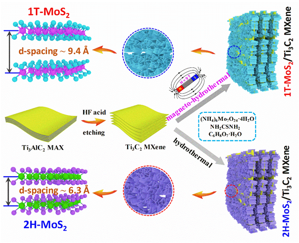 二維材料如過渡金屬二硫化合物、MXene等由于具有豐富的物理和化學性能,使其在諸多領域如電化學領域有著潛在的應用前景。在前期工作中,針對1T相MoS2熱力學亞穩(wěn)態(tài)及無法長期穩(wěn)定保存的難題,課題組采用強磁場水熱法獲得了高度穩(wěn)定、純1T相的MoS2 (ACS Nano 2019, 13, 1694-1702),并研究了導電性、層間距等對MoS2作為超級電容器電極材料的影響 ;成功獲得了V4C3及Ti3C2 MXene并開展了這兩種材料作為超級電容器電極方面的研究。在此工作基礎上,課題組開展了強磁場下過渡金屬二硫化合物1T-MoS2和MXene異質結構方面的相關研究。