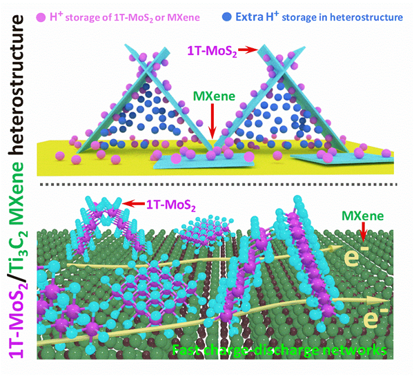 圖2. MoS2/Ti3C2 MXene異質結構的電荷存儲(上圖)及快速充放電(下圖)示意圖