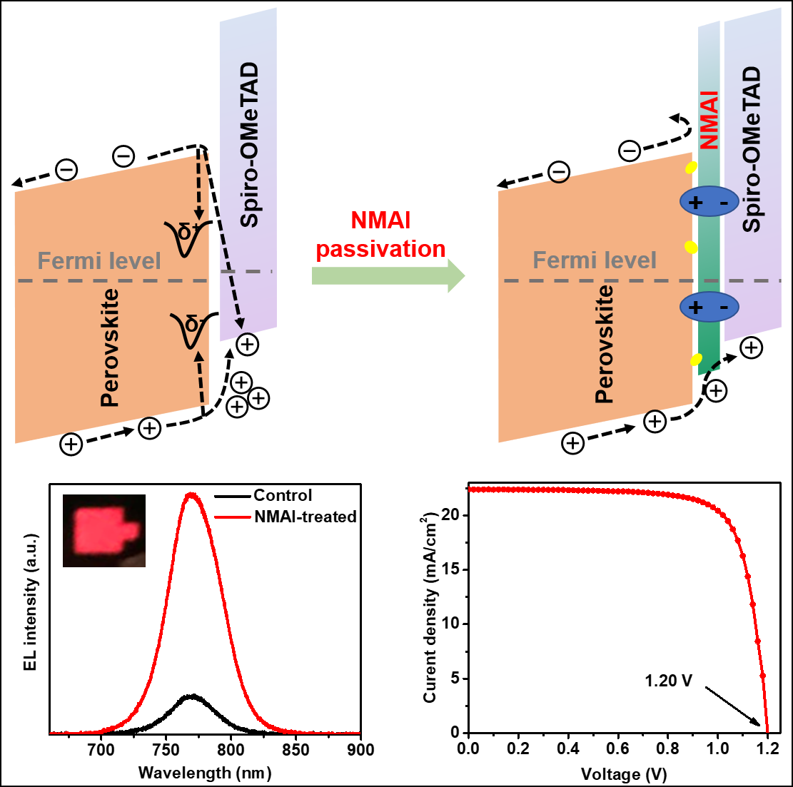 中國科學(xué)院福建物質(zhì)結(jié)構(gòu)研究所功能納米結(jié)構(gòu)設(shè)計與組裝重點實驗室高鵬課題組采用具有大體積的1-萘甲胺碘(NMAI)來鈍化鈣鈦礦表界面。與PEAI一樣,NMAI在強(qiáng)極性的二甲基甲酰胺(DMF)溶液中,與PbI2混合一步旋涂可形成2D鈣鈦礦,并且曾經(jīng)被成功應(yīng)用來制備高效的2D/3D鈣鈦礦LED器件。但是NMAI在弱極性的異丙醇(IPA)溶液中,后處理3D鈣鈦礦薄膜時,表現(xiàn)出與PEAI不同的性質(zhì)。XRD的測試表明,即使在高達(dá)100℃的高溫下,處理后的3D鈣鈦礦薄膜表面絕大部分的銨鹽未參與離子交換反應(yīng),僅形成極少量的2D鈣鈦礦。因此在完整的電池器件中,介于鈣鈦礦和空穴傳輸層之間的NMAI層起到了以下幾個協(xié)同鈍化效果:首先,NMAI本身的兩性離子性質(zhì)能夠鈍化鈣鈦礦的表面離子缺陷;其次,NMAI與鈣鈦礦表面相互作用形成界面偶極,誘導(dǎo)真空能級彎曲,進(jìn)而改善界面的能帶匹配;最后,絕緣的NMAI能夠起到電子阻擋的作用。NMAI層的多重鈍化效應(yīng),使得所制備的鈣鈦礦電池器件表現(xiàn)出較高的電致發(fā)光效率,有力地表明了鈣鈦礦和空穴傳輸層界面的非輻射復(fù)合大大減少。在一個標(biāo)準(zhǔn)太陽光照射下,器件的開路電壓最高達(dá)到1.20 V,光電轉(zhuǎn)換效率最高超過21%。相關(guān)研究結(jié)果發(fā)表在《先進(jìn)能源材料》(Advanced Energy Materials, 2020, DOI: 10.1002/aenm.202000197)。