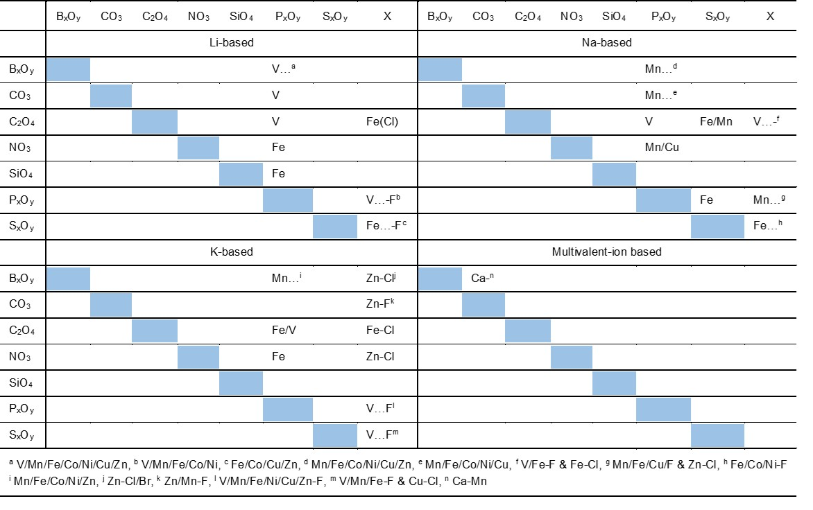 該綜述首先討論了多種金屬離子作為二次電池載荷離子的優(yōu)缺點(diǎn)。載荷離子作為電池最關(guān)鍵的影響因素,其本征物理、化學(xué)特性影響著電池的整體性能。綜述從資源、成本、離子半徑、價(jià)電子勢(shì)、荷質(zhì)比及標(biāo)準(zhǔn)電勢(shì)六大方面,分析了各離子的特征及其作為載荷離子的優(yōu)缺點(diǎn)。其次,作為二次電池的短板,相關(guān)正極材料的性能決定了電池的電化學(xué)性能;尤其是提供電荷補(bǔ)償?shù)倪^(guò)渡金屬離子對(duì)電池的容量、工作電壓、能量密度等有著重要的影響。綜述從過(guò)渡金屬的資源、成本、電勢(shì)、可轉(zhuǎn)移電子數(shù)、環(huán)境友好程度及已知化合物種類(lèi)六方面,分析、比較了常見(jiàn)過(guò)渡金屬作為二次電池正極材料氧化還原對(duì)的優(yōu)缺點(diǎn)。最后,鑒于目前混合聚陰離子型正極材料研究較少的現(xiàn)狀,綜述詳細(xì)闡述了聚陰離子作為正極材料結(jié)構(gòu)框架的穩(wěn)定性?xún)?yōu)勢(shì),總結(jié)了無(wú)機(jī)晶體結(jié)構(gòu)數(shù)據(jù)庫(kù)中已有的混合聚陰離子化合物種類(lèi),指出了多種體系仍未被研究,闡明了在相關(guān)體系發(fā)現(xiàn)新化合物的可能性以及新型正極材料的潛在優(yōu)勢(shì)。該綜述對(duì)發(fā)展高效低成本環(huán)保電池正極材料具有重要指導(dǎo)意義。