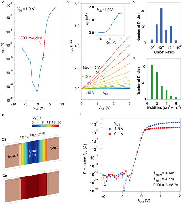 研究人員設(shè)計(jì)了高~300nm的硅晶體臺(tái)階模板,通過濕法噴涂化學(xué)氣相沉積(CVD)方法,實(shí)現(xiàn)了與臺(tái)階側(cè)壁共形生長的過渡族金屬硫化物單原子層晶體(MoS2、WS2等)。通過采用多重刻蝕等微納加工工藝(圖2),制備出以單層極限二維材料作為半導(dǎo)體溝道的鰭式場效應(yīng)晶體管,同時(shí)成功制備出鰭式場效應(yīng)晶體管陣列(圖3)。除此之外,嘗試了引入碳納米管替代傳統(tǒng)金屬作為柵極材料,結(jié)果顯示該材料比傳統(tǒng)金屬柵具有更好的包覆性,可以有效提高器件性能。通過對數(shù)百個(gè)晶體管器件統(tǒng)計(jì)測量,測得電流開關(guān)比達(dá)107,亞閾值擺幅達(dá)300mV/dec(圖4a-d)。理論計(jì)算表明,所提出的鰭式場效應(yīng)晶體管能夠?qū)崿F(xiàn)優(yōu)異的抗短溝道效應(yīng),如漏端引入的勢壘降低(DIBL)可以低至5mV/V(圖4e-f)。