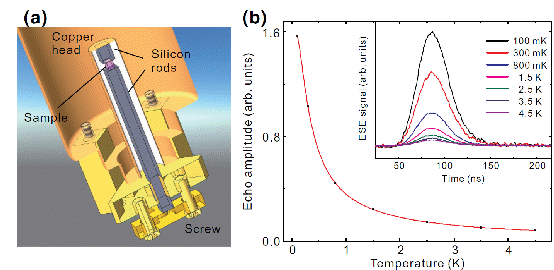 (a)深低溫電子與核自旋雙共振譜儀的樣品局部圖(b)自旋回波信號強(qiáng)度與工作溫度的關(guān)系