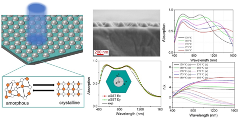 該項研究中,研究人員利用自組裝方式制備的厘米尺寸氧化鋁周期納米孔結(jié)構(gòu)作為掩膜,實現(xiàn)了尺寸為1.5×1.5cm2的Al納米顆粒陣列。通過設(shè)計利用單結(jié)構(gòu)金屬納米顆粒局域等離子體共振與腔法布里-珀羅干涉(FP)共振吸收峰疊加的方式,成功實現(xiàn)了可見到近紅外波段>80%寬帶高效吸收。相變材料鍺銻碲(GST)被設(shè)計作為可調(diào)媒質(zhì)材料,通過溫度控制GST折射率變化,實現(xiàn)了多梯度溫度可控的光功能結(jié)構(gòu)。此外,研究團隊還通過有限元仿真對實驗進行模擬,仿真結(jié)果與實驗結(jié)果很好地吻合,這對相關(guān)物理機制的分析驗證以及進一步的實驗探索提供了很好的指導(dǎo)。相較于以往超材料吸波結(jié)構(gòu)的工作,該研究首次同時解決了帶寬、可調(diào)性及大規(guī)模制備方案等阻礙超材料發(fā)展的難題,未來有望在太陽能電池、智能傳感、成像、彩色打印等領(lǐng)域具有廣泛應(yīng)用。