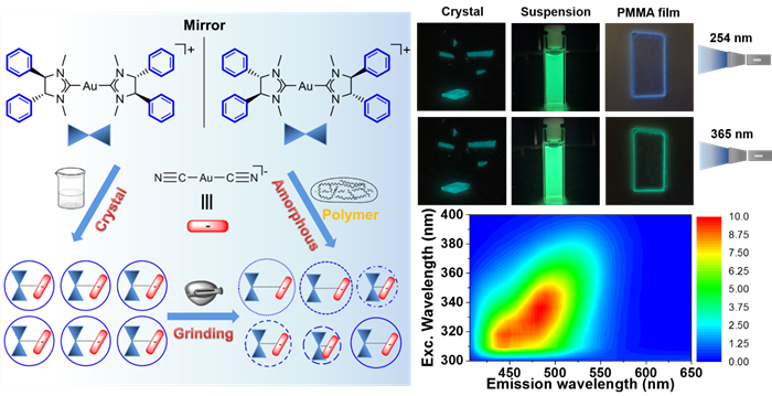 動態刺激響應型材料在智能材料領域具有廣闊的應用前景,其中激發波長依賴的智能發光材料具有操作簡便、非浸入式的特點,引起了人們極大的興趣。近期,中國科學院理化技術研究所光化學轉換與合成研究中心研究員陳勇團隊及其合作者報道了一類具有激發波長依賴的圓偏振發光的金(I)卡賓雙鹽化合物。