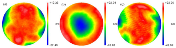 Φ600mm口徑干涉儀標(biāo)準(zhǔn)透射平晶A(a)、標(biāo)準(zhǔn)反射平晶B(b)、以及輔助平晶C(c)的絕對(duì)面形誤差結(jié)果