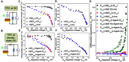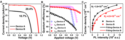 圖3. 鈣鈦礦太陽能電池中的電瞬態研究:Device A and B光電轉換效率(A)量化電荷抽取和收集量子效率(B)以及鈣鈦礦吸收層中的缺陷態密度(C)。