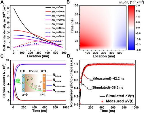圖2. 鈣鈦礦吸收層中電荷傳輸的模擬和光電壓的建立過程