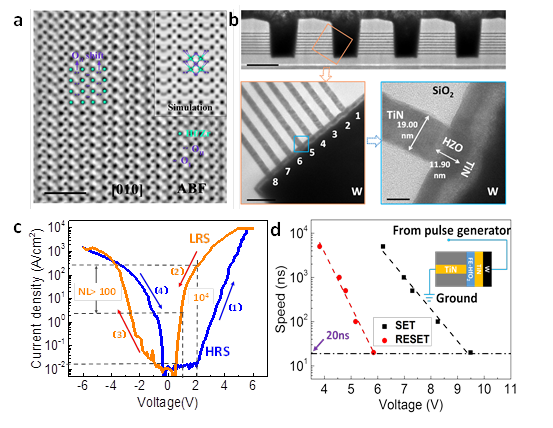 圖(a)HZO鐵電相的原子排列。(b)三維垂直結(jié)構(gòu)的TEM圖。