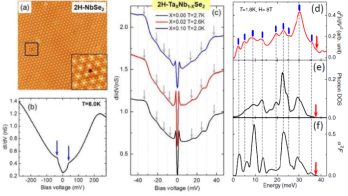 圖1:(a)2H-NbSe2原子圖像;(b)隧道譜上±35mV拐點(diǎn)(箭頭所示);(c)隧道譜上精細(xì)結(jié)構(gòu)(箭頭所示);(d)─(f) 實(shí)驗(yàn)得到的二次微分譜與計(jì)算得到的聲子態(tài)密度和電聲子耦合譜函數(shù)的比對(duì)