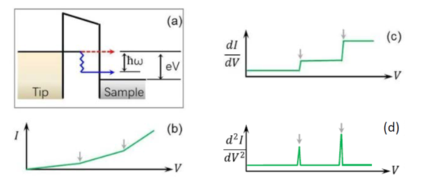 圖2:(a) 非彈性電子隧穿過(guò)程示意圖;(b)─(d) 對(duì)應(yīng)的I-V,dI/dV和d2I/dV2曲線示意